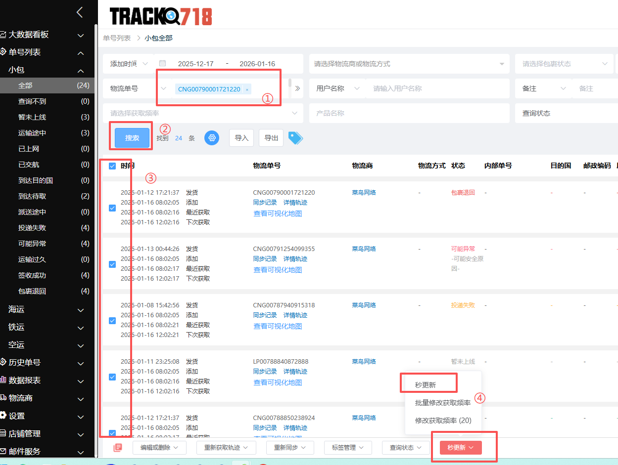 第三步:在需要获取最新轨迹的单号前面进行打√,然后点击页面下方的“秒更新”按钮,选择“秒更新”