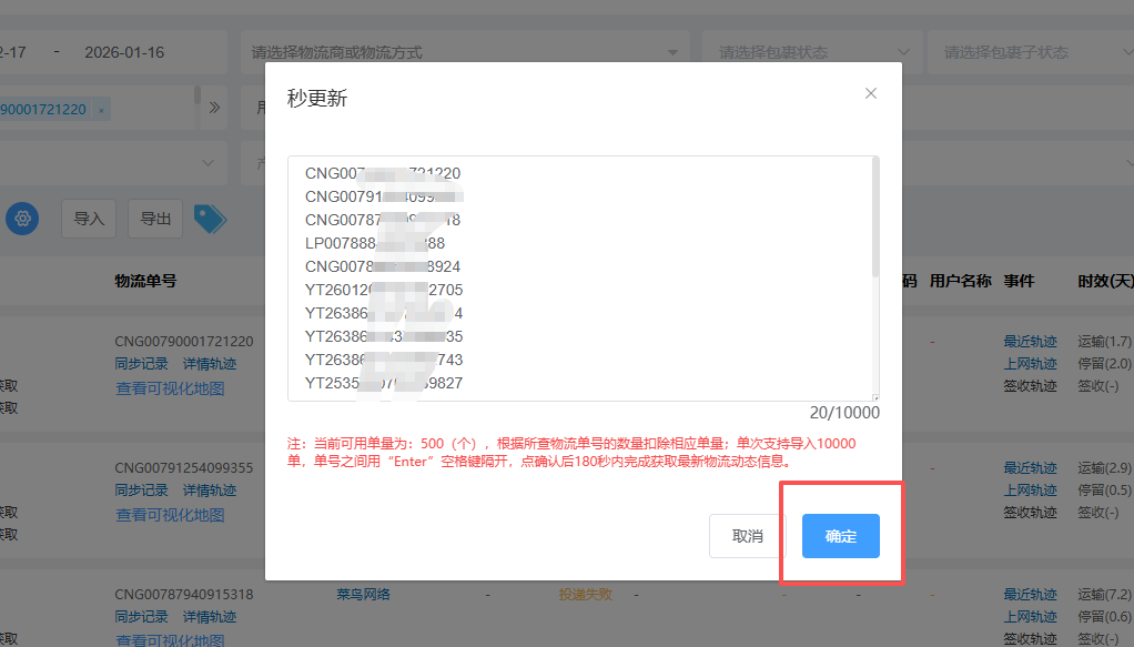 第三步:在弹出的输入框里输入单号后点击“确定”即可,操作注意事项:单次最多输入10000单。