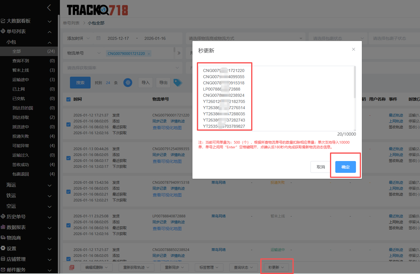 第二步:打开单号列表,点击下方的“秒更新”按钮,打开秒更新输入框。
